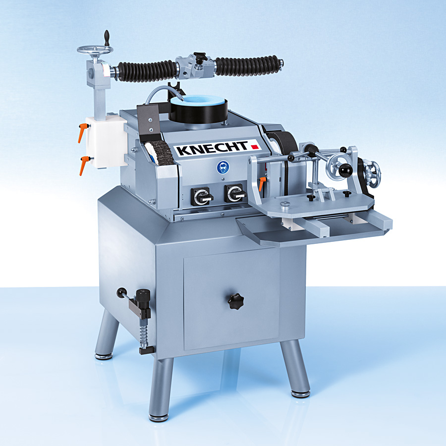- Chłodzony wodą pas szlifujący chroni przed niebezpiecznym przegrzaniem krawędzi noża. Pas szlifujący opasany jest na miękkiej i elastycznej tarczy napędowej zapewniając prawidłowy docisk noża do pasa ściernego.